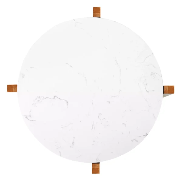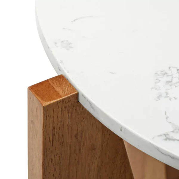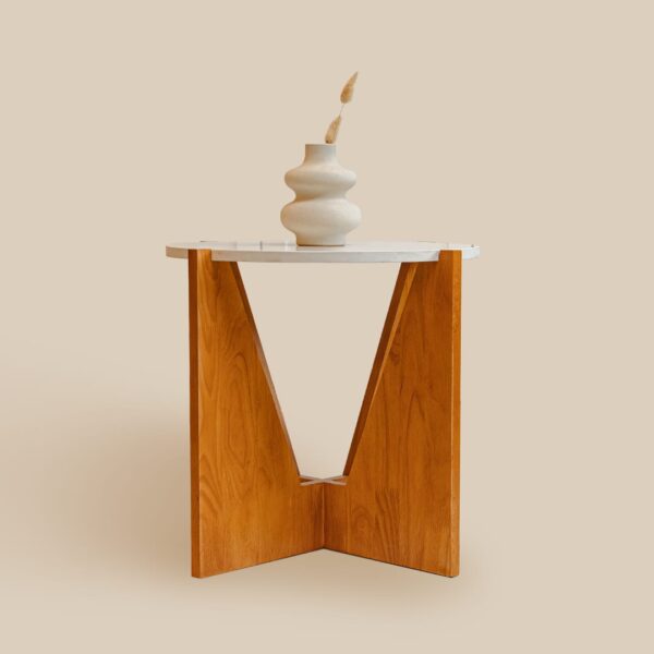 This is a minimalist and modern side table featuring a sturdy wooden "V" base made of polished wood and a smooth, round tabletop, likely made of marble or a similar stone. The warm wood tones contrast elegantly with the white top, making it a stylish addition to contemporary interiors. A simple ceramic vase with dried flowers complements the design.