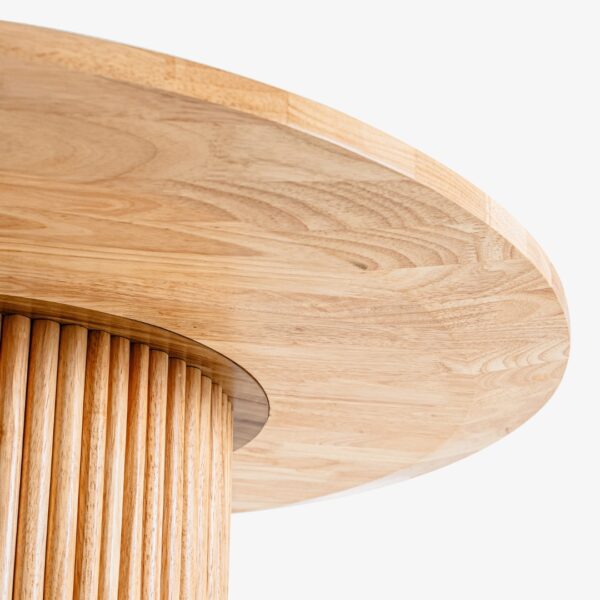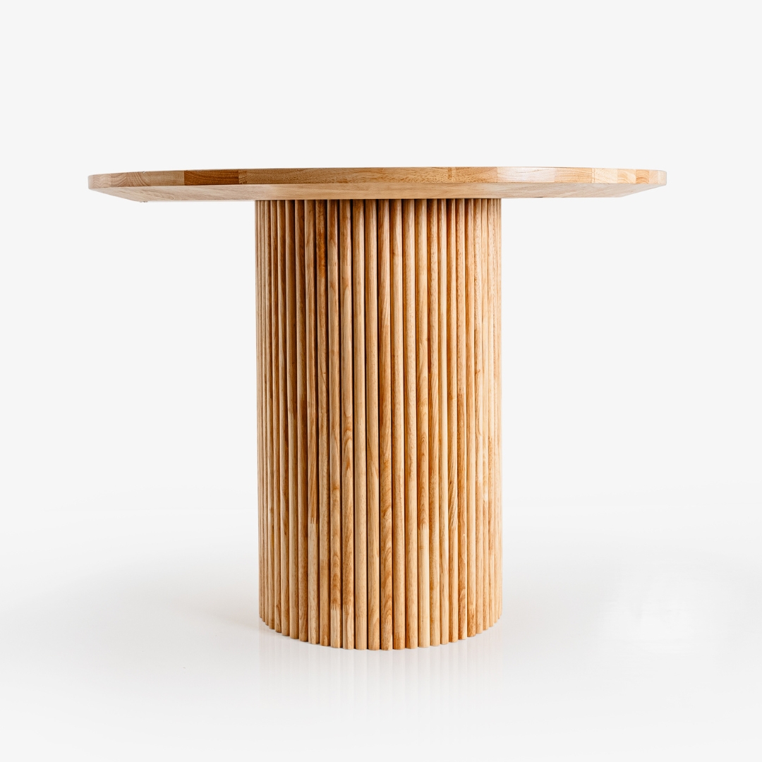 The Fluted Dining Table is a statement piece that blends modern elegance with natural craftsmanship. Featuring a round, solid wood tabletop with a smooth, polished finish, it sits atop a striking cylindrical base adorned with vertical fluted details. The textured base adds depth and dimension, making this table a sophisticated centerpiece for dining spaces. Perfect for contemporary and minimalist interiors, the Fluted Dining Table offers both style and functionality, creating an inviting setting for gatherings and meals.