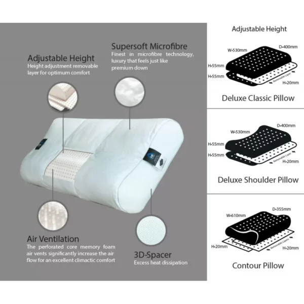 The Hamilton Deluxe Pillow collection is ergonomically designed to provide optimal support and to keep your sleep cool. Each pillow is encased in premium cotton sateen covers with superset microfiber giving it a soft huggable feel. The open pore structure of AIR VISCO™ allows air to circulate freely. 3D Spacer material around the border of the pillow dissipates any body heat that is accumulated in the pillow.